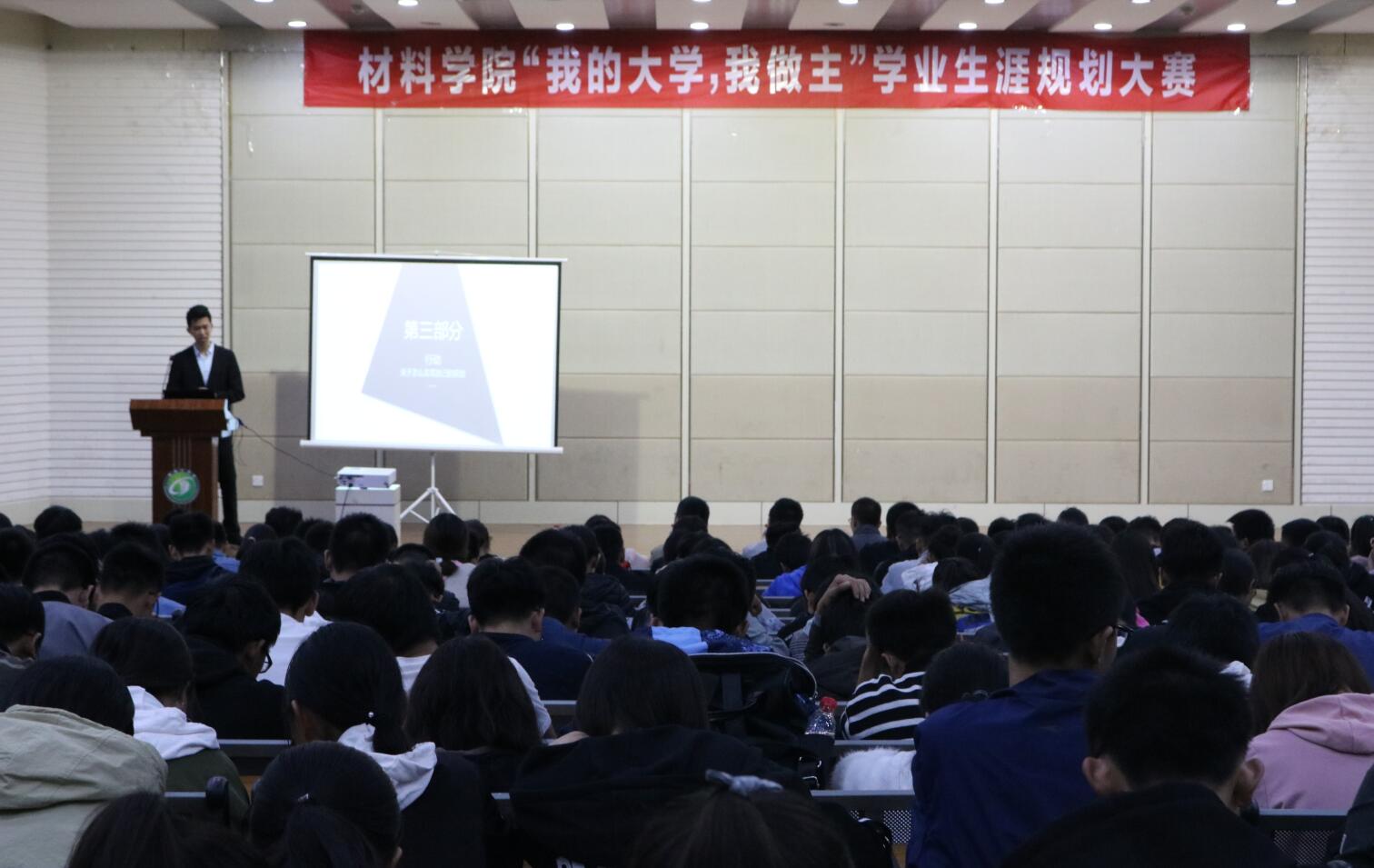10月25日晚,在北校区化工楼报告厅,太阳集团官网举办“我的大学,我做主”学业生涯规划大赛。学生处就业科科长阎小民、思政科副科长于淼、太阳集团官网学工办副主任以及专职辅导员担任评委。2018级400余名学生观看本次比赛。