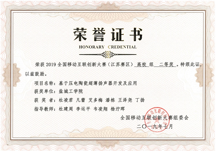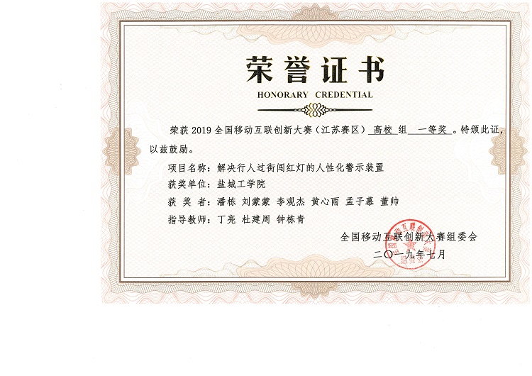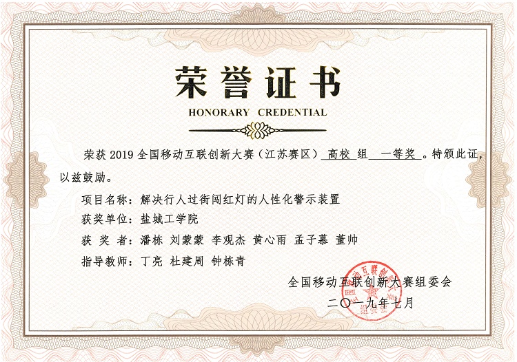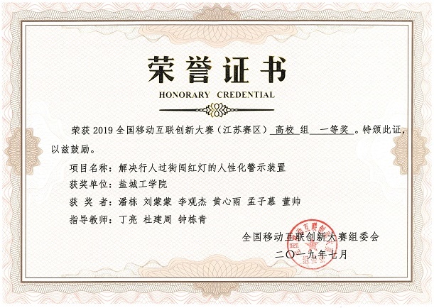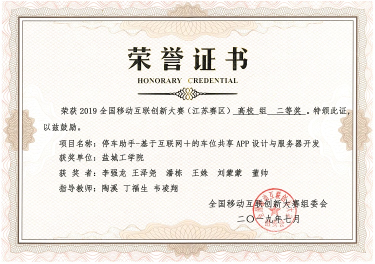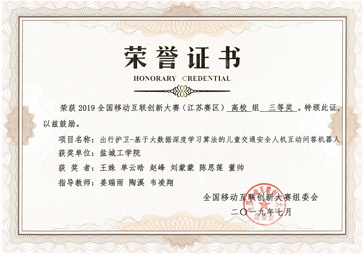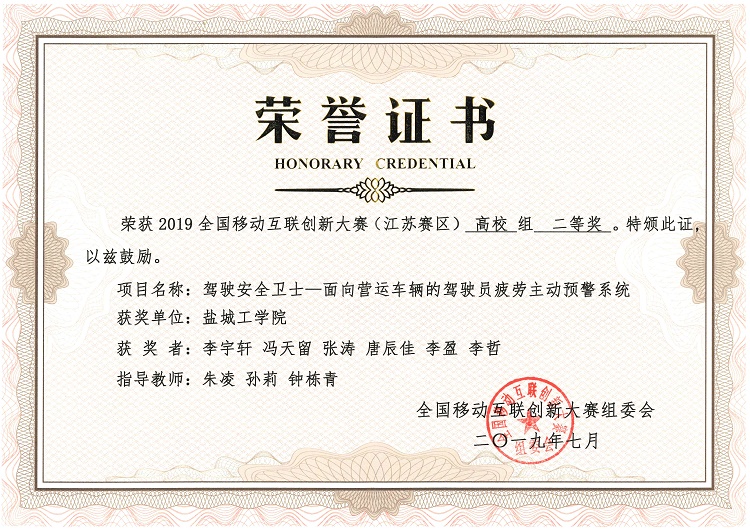 7月5日-6日,2019年全国移动互联创新大赛(高校组)“橙色云杯”江苏省决赛在常州工程职业技术学院举行。经过现场演讲、实物展示、评委提问等环节,在我校老师的悉心指导下,太阳集团官网学生共有5项参赛作品获奖,其中《解决行人过街闯红灯的人性化警示装置》获得一等奖;《基于压电陶瓷超薄扬声器开发与应用》、《停车助手——基于互联网+的车位共享APP设计与服务器开发》、《驾驶安全卫士——面向营运车辆的驾驶员疲劳主动预警系统》分别获得二等奖、《出行护卫——基于大数据深度学习算法的儿童交通安全人机互动问答机器人》获得三等奖。同时,盐城工学院获得优秀组织奖。