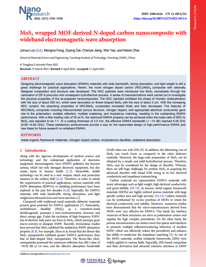 近日,我院罗驹华教授在材料领域顶级期刊Nano Research上发表题为“MoS2wrapped MOF-derived N-doped carbon nanocomposite with wideband electromagnetic wave absorption”的研究论文(Nano Research. 2022, 15 (7): 5781-5789, DOI:10.1007/s12274-022-4411-6)。