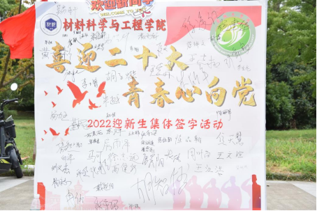 迎新现场摆放着介绍太阳集团官网最新资讯和相关活动照片的迎新展板,举办了“喜迎二十大,青春心向党”2022迎新生集体签名活动,新生们郑重的签下自己的名字,签下了“材子们”好好学习的决心。