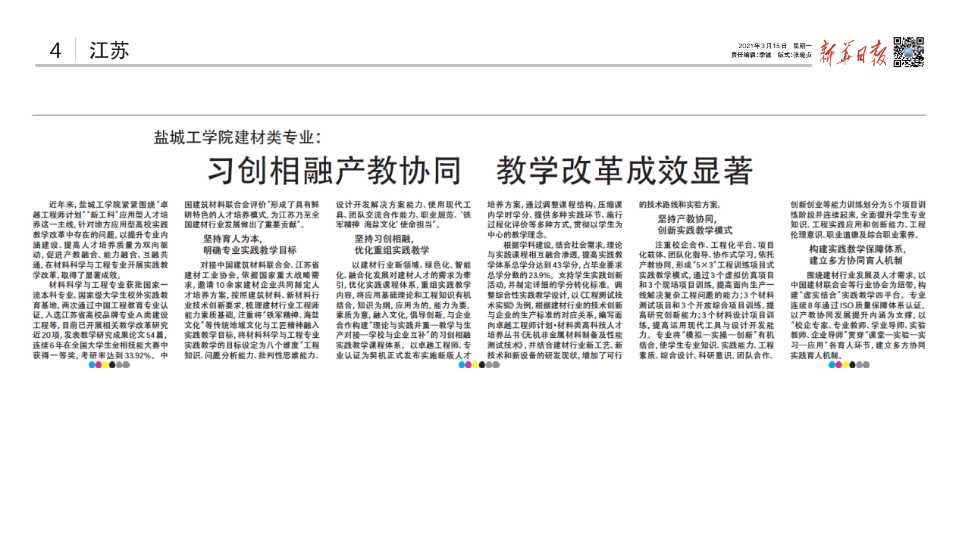 对接中国建筑材料联合会、江苏省建材工业协会,依据国家重大战略需求,邀请10余家建材企业共同制定人才培养方案,按照建筑材料、新材料行业技术创新要求,梳理建材行业工程师能力素质基础,注重将“铁军精神、海盐文化”等传统地域文化与工匠精神融入实践教学目标,将材料科学与工程专业实践教学的目标设定为八个维度“工程知识、问题分析能力、批判性思维能力、设计开发解决方案能力、使用现代工具、团队交流合作能力、职业规范、‘铁军精神 海盐文化’使命担当”。