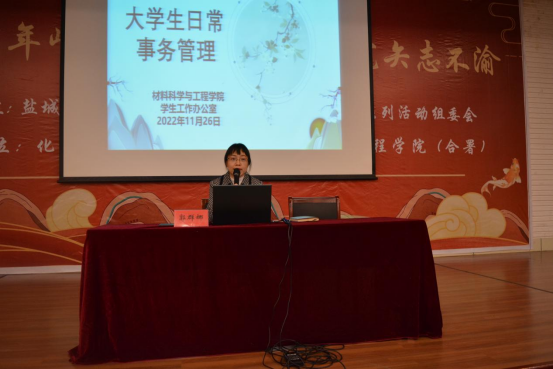 11月27日下午,太阳集团官网党委副书记朱凌和学工办主任郭群娜分别为新生开展入党启蒙教育和大学生日常事务管理教育讲座,新生辅导员、全体2022级新生400余人参加。