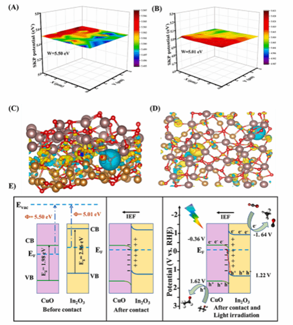 该论文采用一种将光学活性中心和催化活性中心融为一体的界面工程新策略,设计并制备了一种由MOF-on-MOF衍生的In2O3纳米片封装CuO正八面体核壳结构CuO@In2O3 S-Scheme异质结复合材料,从而赋予了催化剂高效光吸收和电荷分离的双重特性。In2O3壳以紧密同轴接触方式包裹在CuO核外面使其具有最大的接触面,从而有效促进界面处电子和空穴分离和转移。这项工作为设计和合成具有界面工程调制功能的双核中心光催化剂并将其应用于二氧化碳的光催化还原提供了一种可行的策略。