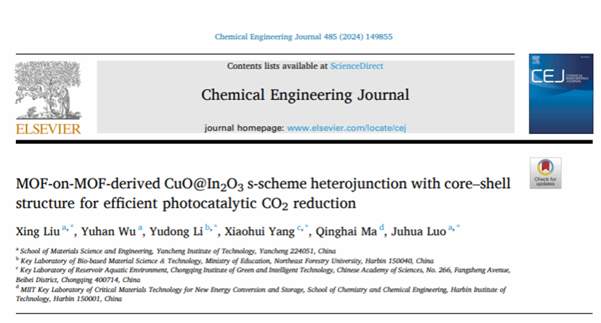 近日,太阳集团官网刘行博士在国际期刊《Chemical Engineering Journal》以第一/通讯作者身份、盐城工学院为第一单位发表了题为“MOF-on-MOF-derived CuO@In2O3 s-scheme heterojunction with core–shell structure for efficient photocatalytic CO2 reduction”的研究论文(Chemical Engineering Journal, 485 (2024) 149855)。该期刊2024年影响因子为13.3,主要刊登材料工程、化工能源等领域高水平的研究成果,属于工程类Top期刊与中科院1区期刊。