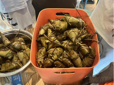 高姗老师带着学生干部把提前泡好的糯米、红豆、粽叶等整齐的摆放在桌子上,并先为同学们演示如何卷粽叶,放米捆绳。同学们认真学习亲自实践,体会劳动的快乐和意义。现场分三组人员,一组包白粽,一组包蜜枣粽,另一组包红豆粽。尽管大家的技术水平参差不齐,无论是技术娴熟还是新手上路大家都特别开心,食堂里洋溢着欢声笑语。经过大家的辛勤劳作,近百个形态各异的粽子出炉了。空气中散发着清爽甘醇的气息,香喷喷的粽子味道飘满整个食堂。在此也要感谢食堂的阿姨叔叔们提供煮粽子的场所!